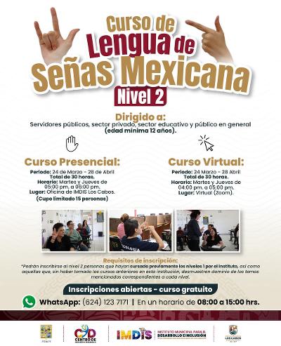 En cuanto al nivel 2, se ofrecerá de manera presencial en las oficinas del IMDIS en San José del Cabo, del 24 de marzo al 28 de abril, con sesiones los martes y jueves de 17:00 a 18:00 horas, con cupo limitado a 15 personas. También se contará con modalidad virtual en el mismo periodo, a través de Zoom, con clases los martes y jueves de 16:00 a 17:00 horas.