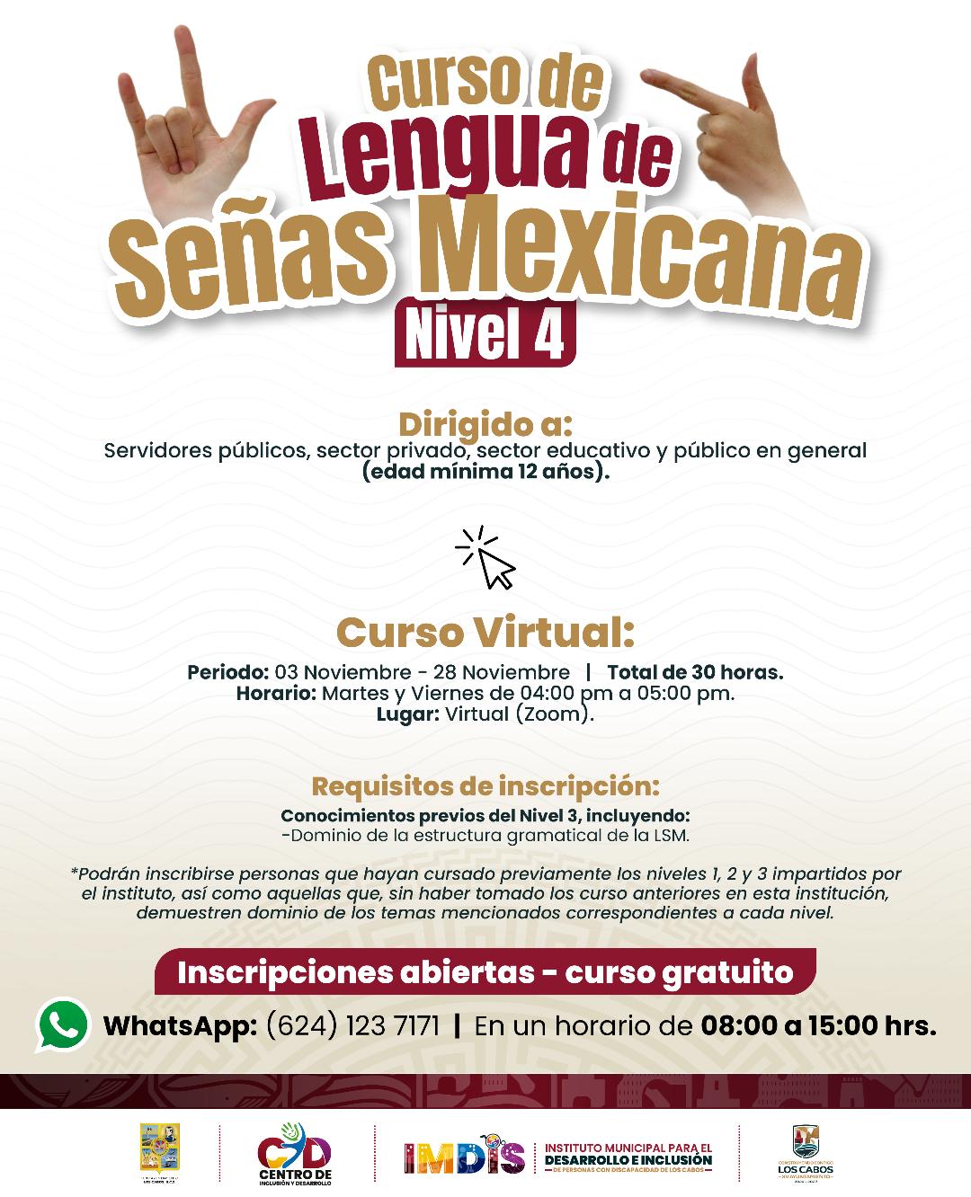 Los Cabos, Baja California Sur.- Con el propósito de fortalecer la inclusión y mejorar la comunicación con personas con discapacidad auditiva en el municipio, el Instituto Municipal para el Desarrollo e Inclusión de Personas con Discapacidad (IMDIS) abrió las inscripciones para los cursos gratuitos de Lengua de Señas Mexicana (LSM), niveles 1 y 4, dirigidos a servidoras y servidores públicos, personal del sector privado, integrantes de la comunidad educativa y ciudadanía en general.