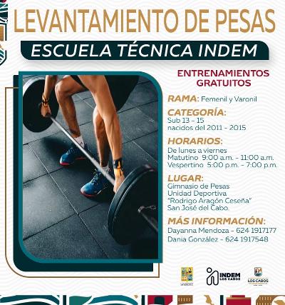 Los Cabos, Baja California Sur.– El Instituto del Deporte del Municipio de Los Cabos (INDEM) abrió la convocatoria para integrarse a la Escuela Técnica de Levantamiento de Pesas, programa dirigido a jóvenes de San José del Cabo que busca impulsar el talento deportivo en esta disciplina.