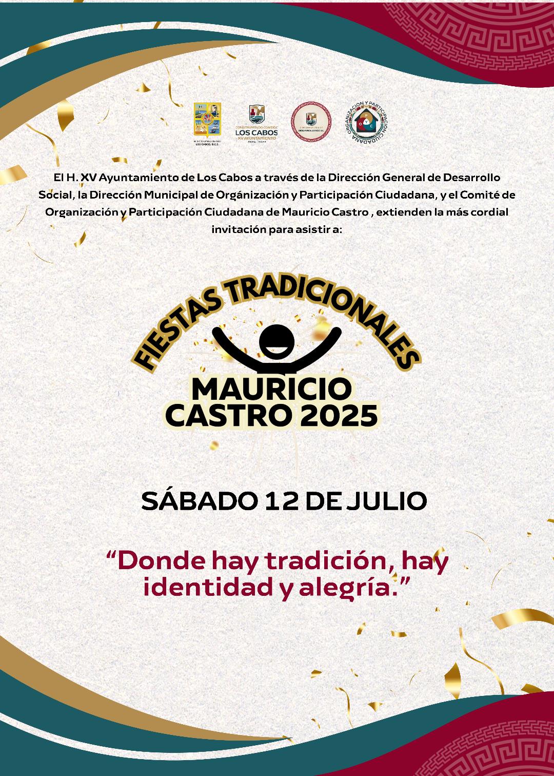 Los Cabos, Baja California Sur.- Habitantes de la colonia Mauricio Castro en San José del Cabo, se preparan celebrar sus Fiestas Tradicionales el próximo sábado 12 de julio, con un programa que iniciará desde las 05:00 de la tarde con actividades recreativas diseñadas para la niñez y familias en general, mismas que se desarrollarán en el campo de fútbol de la colonia.