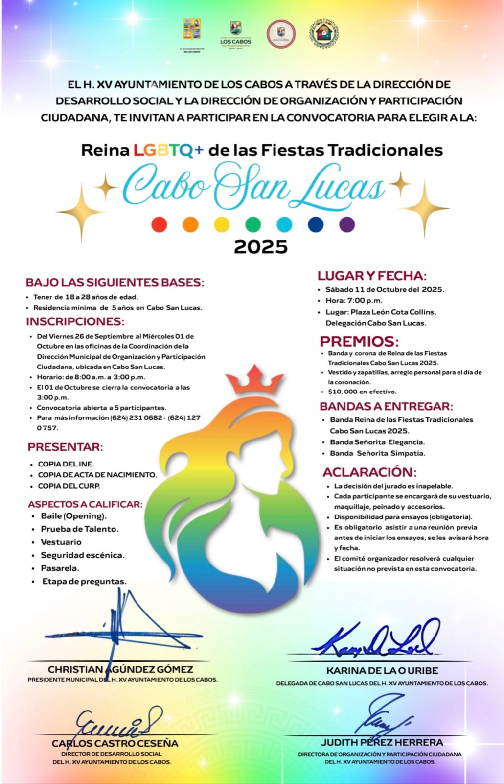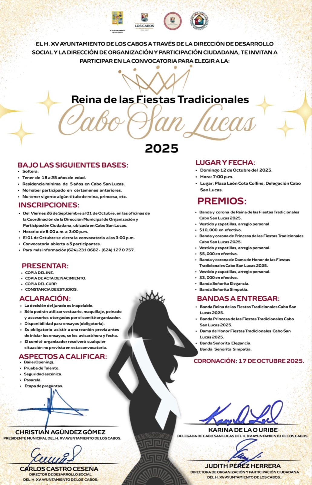 Los Cabos, Baja California Sur.– El XV Ayuntamiento de Los Cabos, a través de la Dirección General de Desarrollo Social y la Dirección Municipal de Organización y Participación Ciudadana, anunció de manera oficial las convocatorias para los certámenes que formarán parte de las Fiestas Tradicionales Cabo San Lucas 2025.