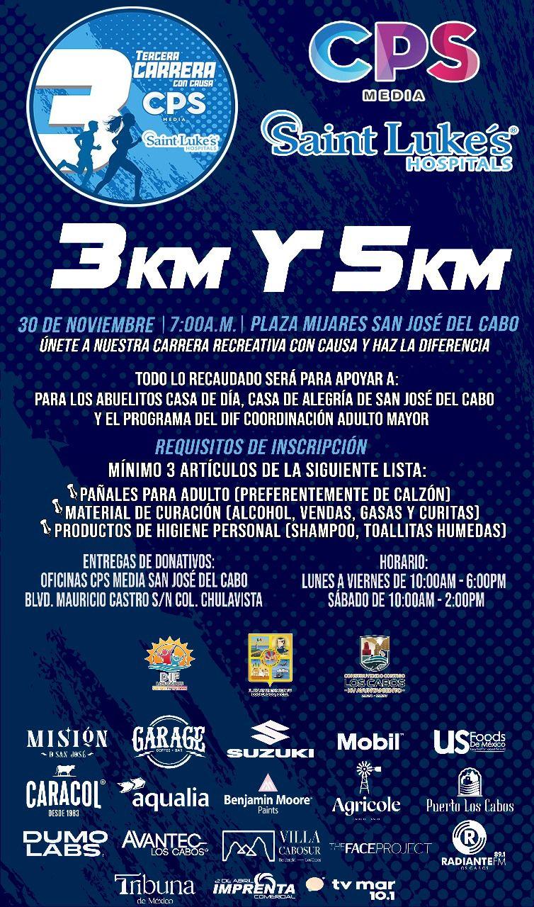 Los Cabos, Baja California Sur.- En rueda de prensa, se dieron a conocer los detalles de la tercera Carrera Recreativa y Familiar con Causa, un evento impulsado por CPS Media y Hospital Saint Luke’s, que se realizará el próximo 30 de noviembre a las 07:00 horas en la plaza pública Antonio Mijares de San José del Cabo, en apoyo a usuarias y usuarios de la Casa de Día – Casa de Alegría de San José del Cabo del Sistema para el Desarrollo Integral de la Familia DIF Los Cabos, a través de su Coordinación del Adulto Mayor.