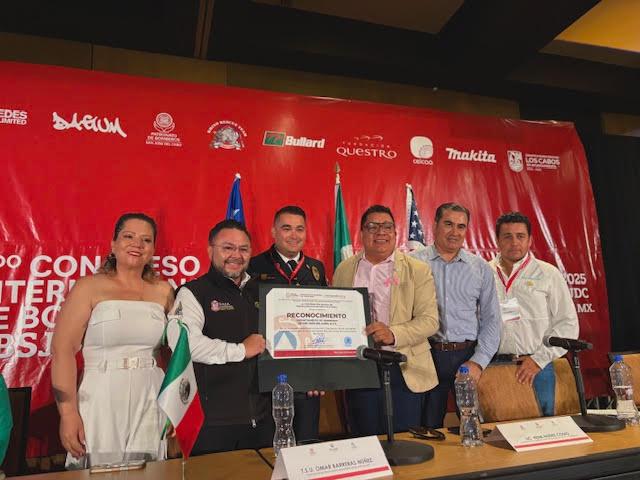Durante el evento, el coordinador estatal de Protección Civil de Baja California, Salvador Cervantes Hernández, y el capitán Constantino León, entregaron un reconocimiento al Departamento de Bomberos de San José del Cabo por su apoyo durante los incendios forestales de junio y julio.