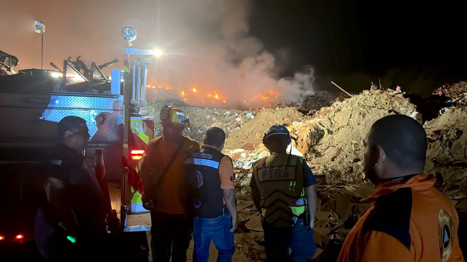 Los Cabos, Baja California Sur.– El XV Ayuntamiento de Los Cabos informa que desde la noche del martes se mantienen activas las labores de atención, control y mitigación del incendio registrado en el basurero a cielo abierto de la comunidad de Las Cuevas, en la delegación de Santiago. La emergencia fue atendida mediante un operativo interinstitucional encabezado por la Dirección Municipal de Protección Civil y el Departamento de Bomberos de San José del Cabo, con apoyo de diversas áreas municipales.