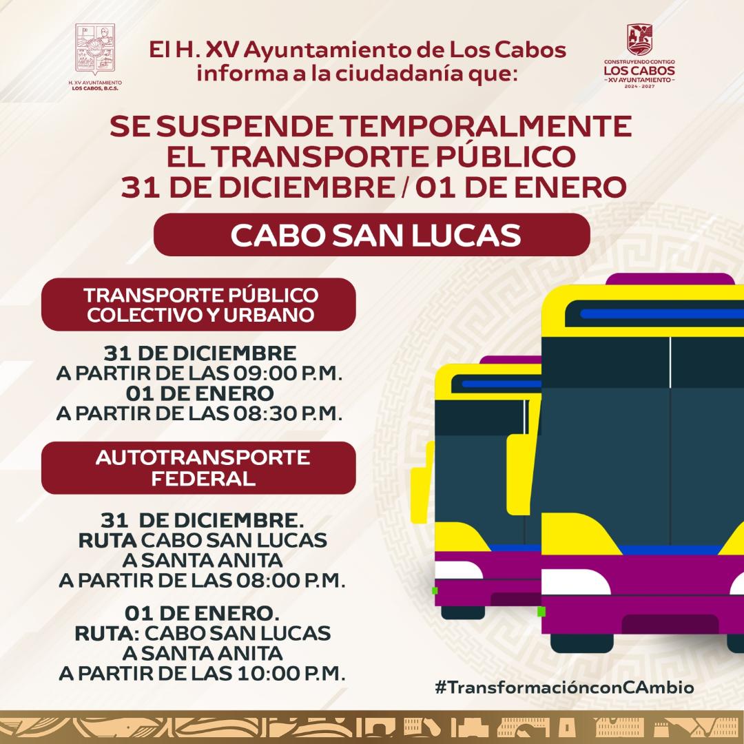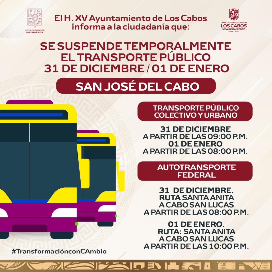 Los Cabos, Baja California Sur.- El XV Ayuntamiento de Los Cabos a través de la Dirección Muncipal de Transporte, informa a la ciudadanía que, con motivo de las celebraciones de Año Nuevo y como medida preventiva para garantizar una movilidad ordenada y segura, se implementarán la suspensión temporal del servicio del transporte público colectivo, urbano y del autotransporte federal, durante el 31 de diciembre y el 01 de enero.