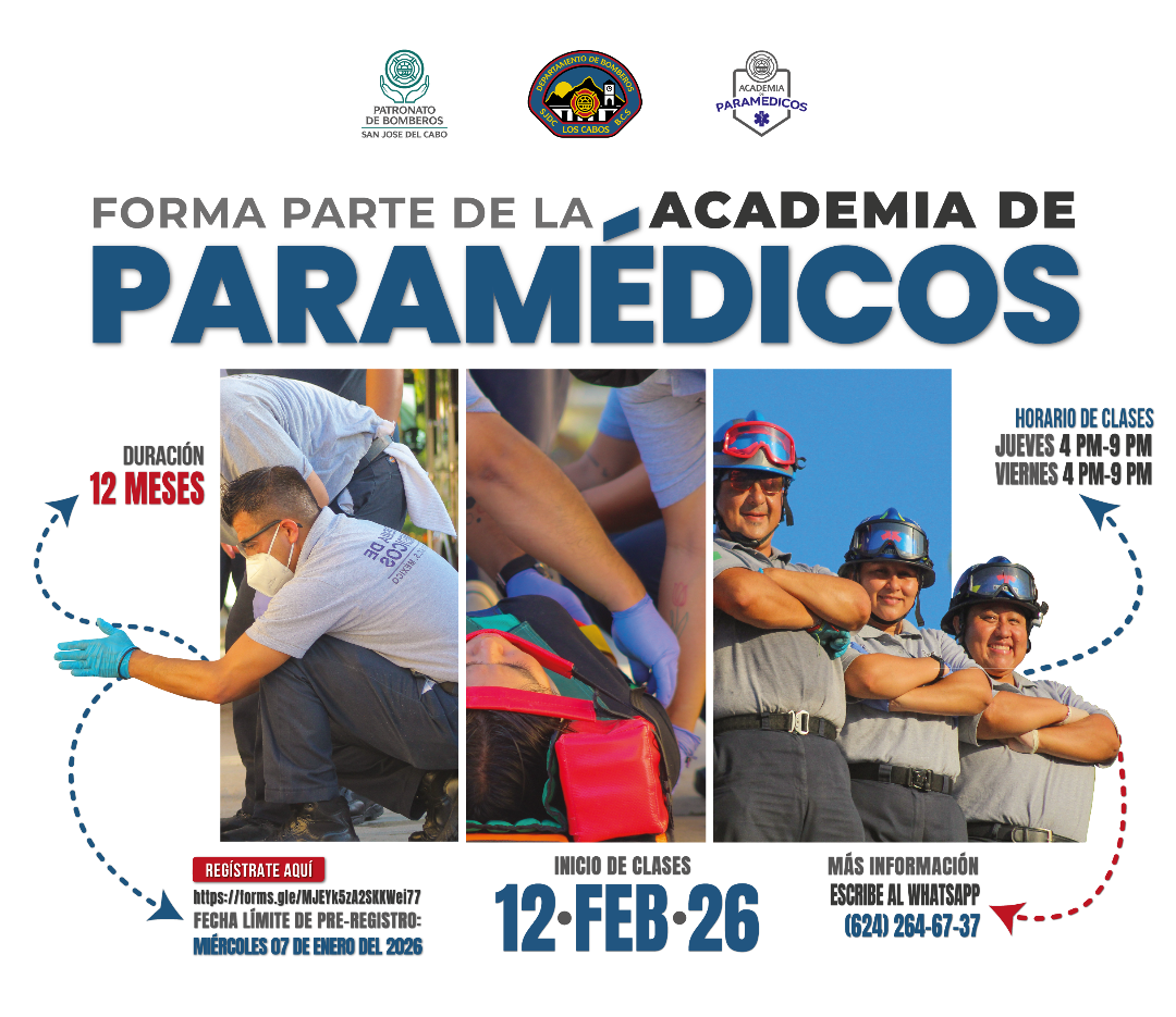 Los Cabos, Baja California Sur.- El Departamento de Bomberos de San José del Cabo abre su convocatoria para que las y los interesados formen parte de la IV generación de la Academia de Paramédicos, la cual, tiene una duración de 12 meses donde, las y los cadetes adquirirán los conocimientos teóricos y prácticos que les garantizarán su desempeño laboral dentro del sistema de emergencias y áreas afines, además obtendrán su certificación de Atención Prehospitalaria Nivel Básico del Consejo Nacional de Normalización y Certificación de Competencias Laborales CONOCER EC 307.01.