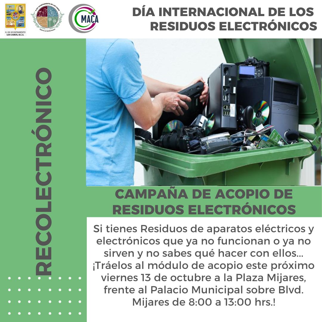 ‘’En el marco de la conmemoración del Día Mundial de los Desechos Electrónicos, este viernes 13 de octubre, iniciaremos en punto de las 8:00 de la mañana hasta las 12:00 de la tarde, la Campaña de Centros de Acopio de Residuos Electrónicos frente a Palacio Municipal en San José del Cabo, donde estaremos recibiendo todo tipo de desechos electrónicos que ya estén fuera de servicio, esto con el objetivo de darles un final adecuado a este tipo de desechos y evitar la contaminación, todo esto en conjunto con la empresa Maca Electrónicos, autorizada para dicho centro de acopio’’, aseguró la directora de Educación, Divulgación y Promoción Ambiental, Laura Esther Ceseña Márquez.