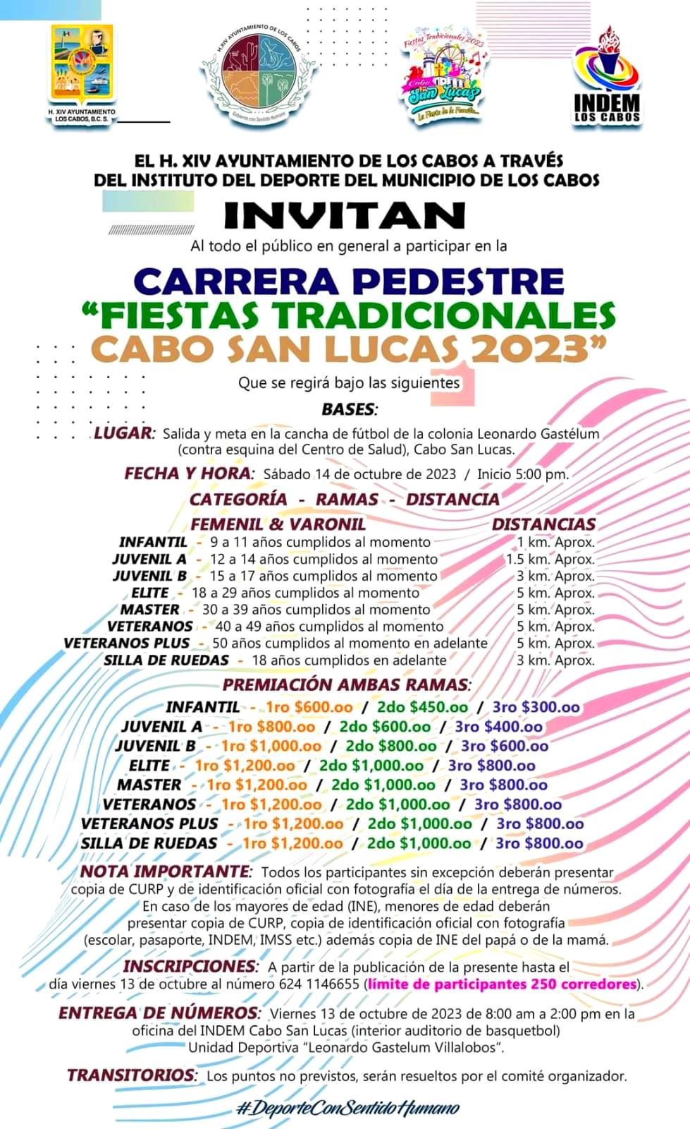 Los Cabos, B.C.S., 13 octubre 2023.- Con premios en efectivo que van desde los $1 mil 200 para los primeros lugares, se llevará a cabo la Carrera Pedestre de las Fiestas Tradicionales Cabo San Lucas 2023, el próximo sábado 14 de octubre en la cancha de fútbol de la colonia Leonardo Gastelum a las 05:00 de la tarde y el registro continúa abierto para el público en general hasta hoy a las 02:00 de la tarde.