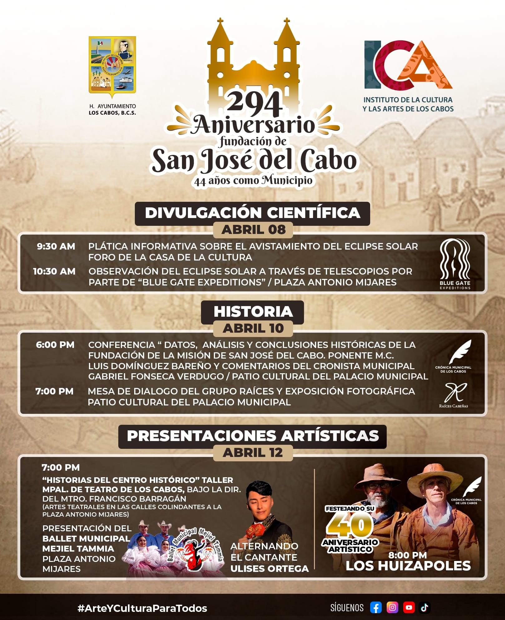 Los Cabos, B.C.S., 03 abril 2024.- El H. Ayuntamiento de Los Cabos a través del Instituto de la Cultura y las Artes, en coordinación con la Crónica municipal, Grupo Raíces y con apoyo de Blue Gate Expeditions, te invitan a la semana de celebración del 294° aniversario de la fundación de San José del Cabo y 44 años como municipio.