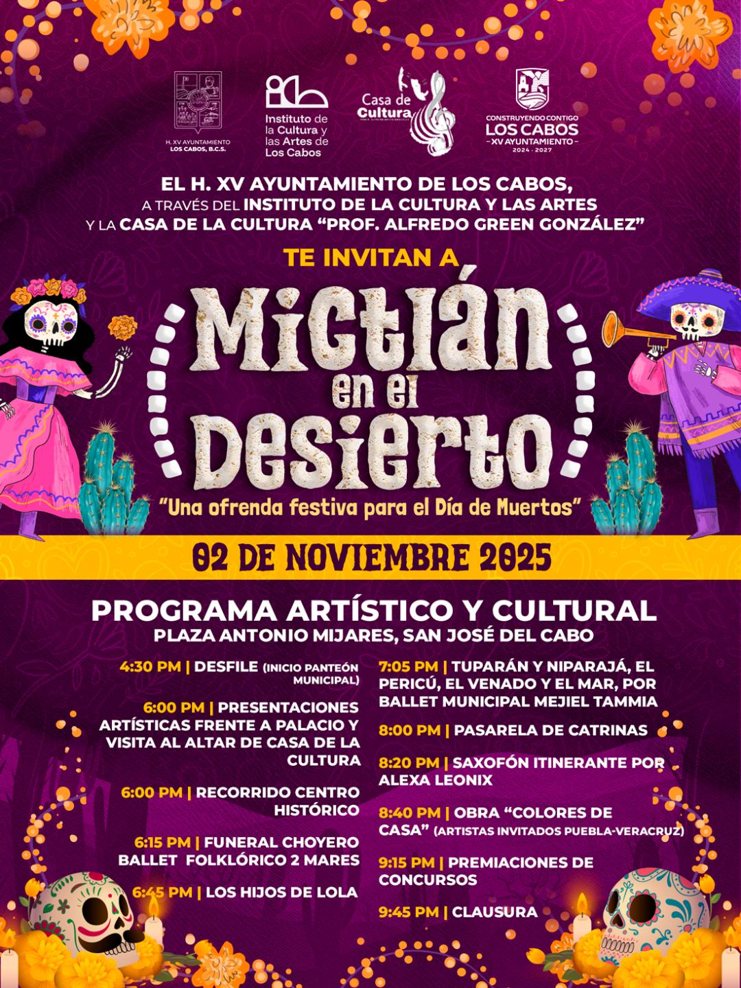 Los Cabos, Baja California Sur.– El XV Ayuntamiento de Los Cabos, a través del Instituto de la Cultura y las Artes (ICA), invita a la ciudadanía a participar en la celebración del Día de Muertos 2025 “Mictlán en el Desierto”, una jornada dedicada a la tradición, el arte y la memoria colectiva.