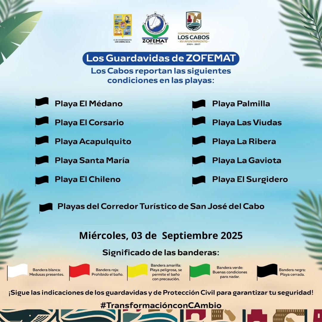 Actualmente, las playas El Médano, El Corsario, Acapulquito, Santa María, El Chileno, Palmilla, Las Viudas, La Ribera, La Gaviota, El Surgidero y las del corredor turístico de San José del Cabo se mantienen bajo bandera negra, lo que significa que se encuentran cerradas al acceso por seguridad.