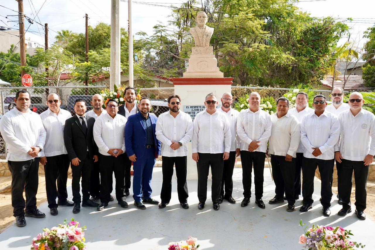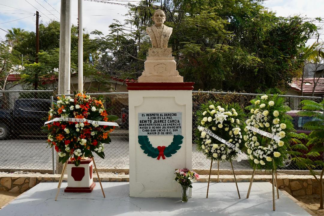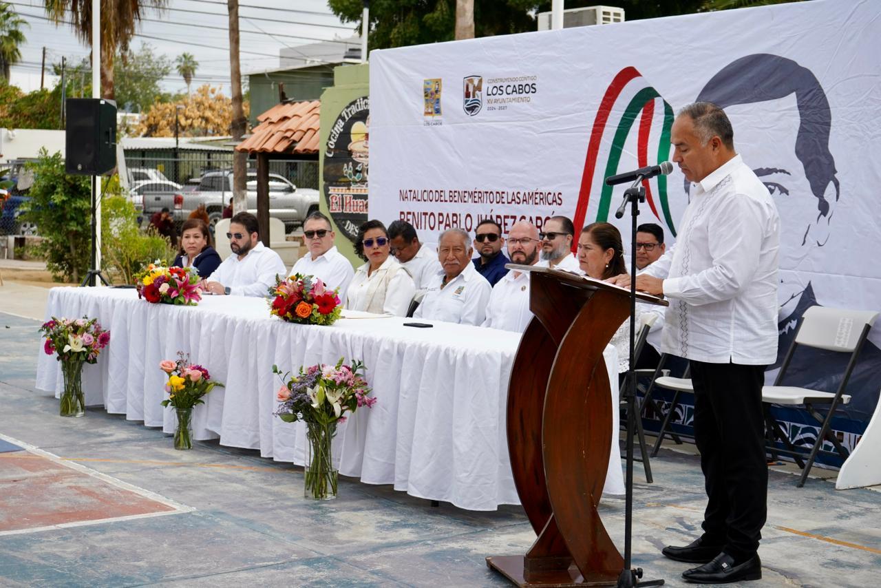 Los Cabos, Baja California Sur.– En el marco del 220° aniversario del natalicio de Benito Juárez García, autoridades municipales, educativas y representantes de la sociedad civil llevaron a cabo un acto cívico en su honor en la cancha de la colonia Benito Juárez, en Cabo San Lucas.