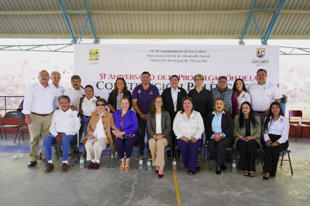 Los Cabos, Baja California Sur.– En el marco del 51° aniversario de la promulgación de la Constitución Política del Estado de Baja California Sur, la Coordinación de Educación llevó a cabo una ceremonia cívica en las instalaciones de la Escuela Secundaria General Constituyentes de Baja California Sur, en la Delegación de Cabo San Lucas, con la participación de autoridades delegacionales, educativas, personal docente y alumnado.