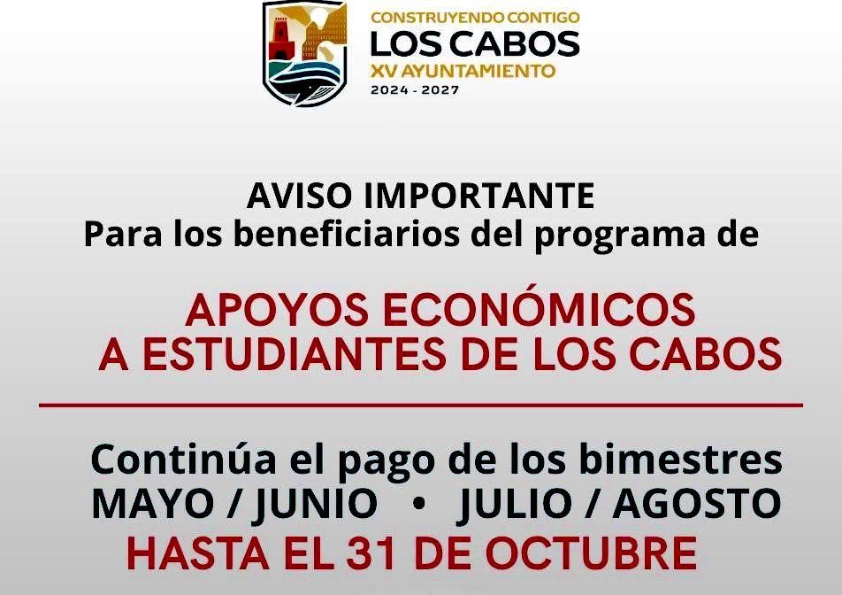 Los Cabos, Baja California Sur.- El XV Ayuntamiento de Los Cabos, a través de la Dirección Municipal de Educación, informa a las y los beneficiarios del programa Apoyos Económicos a Estudiantes de Los Cabos que continúa el proceso de pago correspondiente a los bimestres mayo-junio y julio-agosto, mismo que se extenderá hasta el 31 de octubre del presente año.