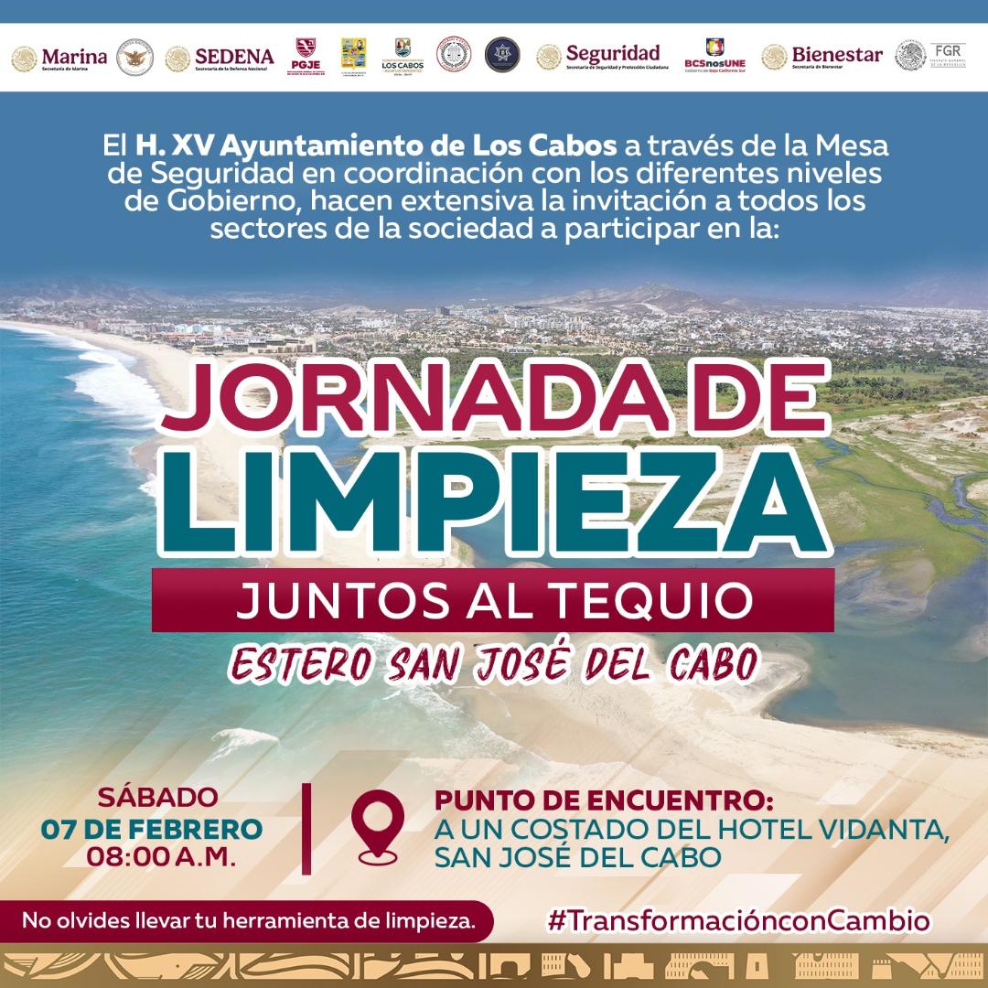 Los Cabos, Baja California Sur.- El XV Ayuntamiento de Los Cabos, a través de la Mesa de Seguridad y en coordinación con los diferentes niveles de Gobierno, hace una extensiva invitación a todos los sectores de la sociedad para participar en la jornada de limpieza denominada «Juntos al Tequio», la cual se realizara en el Estero de San José del Cabo el próximo sábado 07 de febrero a partir de las 08:00 de la mañana.