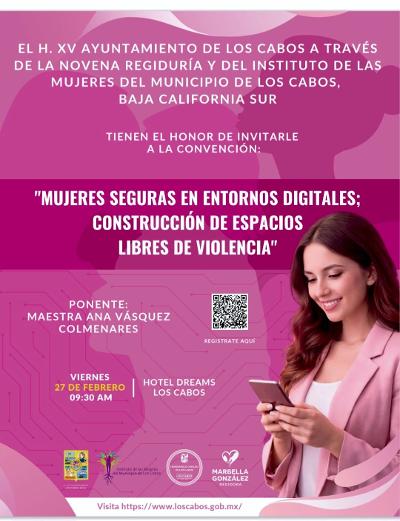 Los Cabos, Baja California Sur.- Como parte de las actividades en conmemoración del 08 de marzo, Día Internacional de las Mujeres, el H. XV Ayuntamiento de Los Cabos, a través de la Novena Regiduría encabezada por Lorena Marbella González Díaz y en colaboración con el Instituto de las Mujeres del Municipio de Los Cabos (IMMLC) bajo la direcion de Araceli García Rico, realizará la convención «Mujeres Seguras en Entornos Digitales; Construcción de Espacios Libres de Violencia”, el próximo viernes 27 de febrero a las 09:30 de la mañana en el Hotel Dreams.