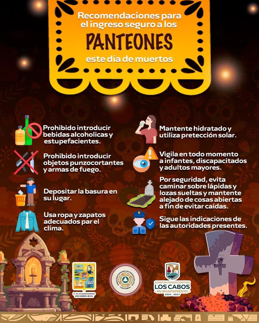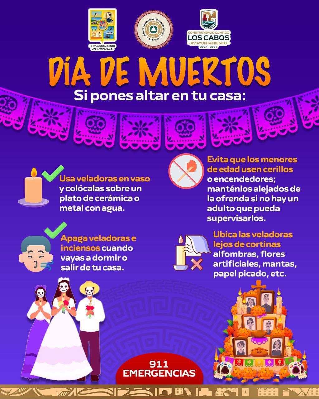 Los Cabos, Baja California Sur.– En el marco de las actividades del Día de Muertos, el XV Ayuntamiento de Los Cabos, a través de la Dirección Municipal de Protección Civil, emite una serie de recomendaciones preventivas con el propósito de garantizar la seguridad y bienestar de la población durante las visitas a los panteones municipales y actividades alusivas a esta importante tradición.