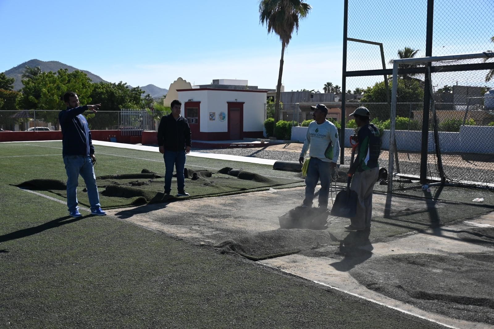 Los Cabos, Baja California Sur. – Como parte de la transformación de este Municipio, el Instituto del Deporte del Municipio de Los Cabos (INDEM) inició este año con los trabajos de rehabilitación en el campo de fútbol de la colonia San Bernabé, ubicada en San José del Cabo, con una inversión de $70 mil 500 pesos, recurso propio del INDEM, informó Elton Olachea, director general del Instituto.