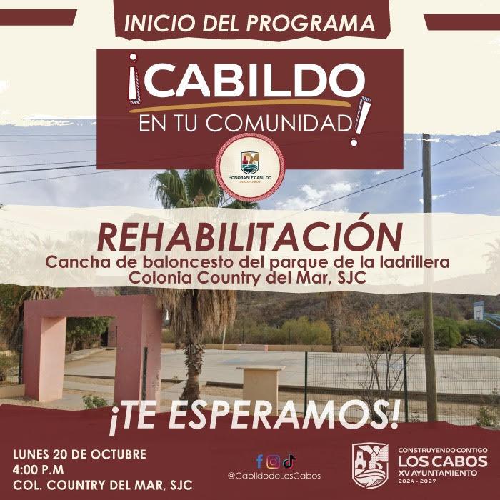 Los Cabos, Baja California Sur.- Este lunes 20 de octubre a las 16:00 horas, el XV Ayuntamiento de Los Cabos pondrá en marcha el programa “Cabildo en tu comunidad”, con la rehabilitación de la cancha de baloncesto del parque de la ladrillera, ubicada en la colonia Country del Mar, en San José del Cabo.