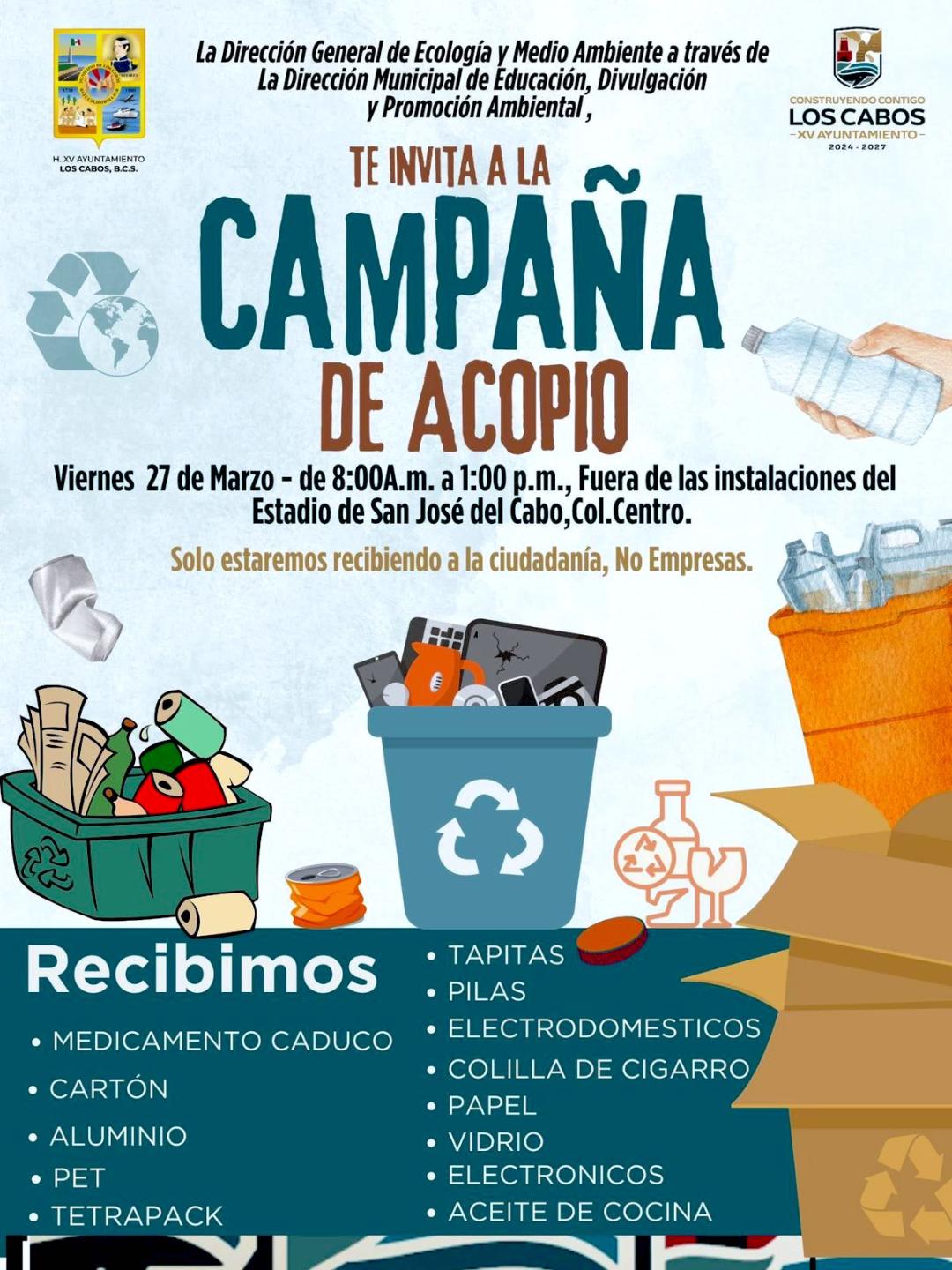 Los Cabos, Baja California Sur.– El XV Ayuntamiento de Los Cabos, a través de la Dirección General de Ecología y Medio Ambiente, realizará este viernes 27 de marzo una jornada de acopio de materiales reciclables en San José del Cabo.