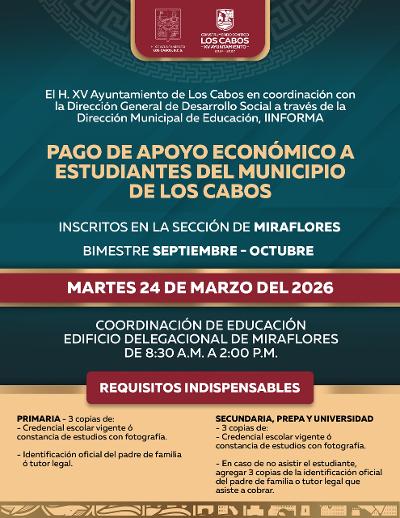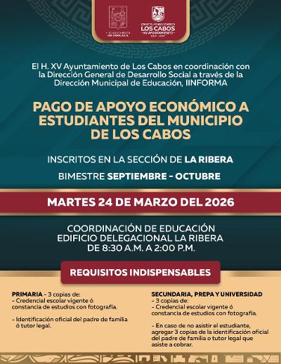 Los Cabos, Baja California Sur.– El XV Ayuntamiento de Los Cabos, en coordinación con la Dirección General de Desarrollo Social y la Dirección Municipal de Educación, informa a la comunidad estudiantil sobre la próxima entrega del pago de apoyo económico correspondiente al bimestre septiembre–octubre, que se llevará a cabo de manera simultánea en todas las delegaciones del municipio el próximo martes 24 de marzo.