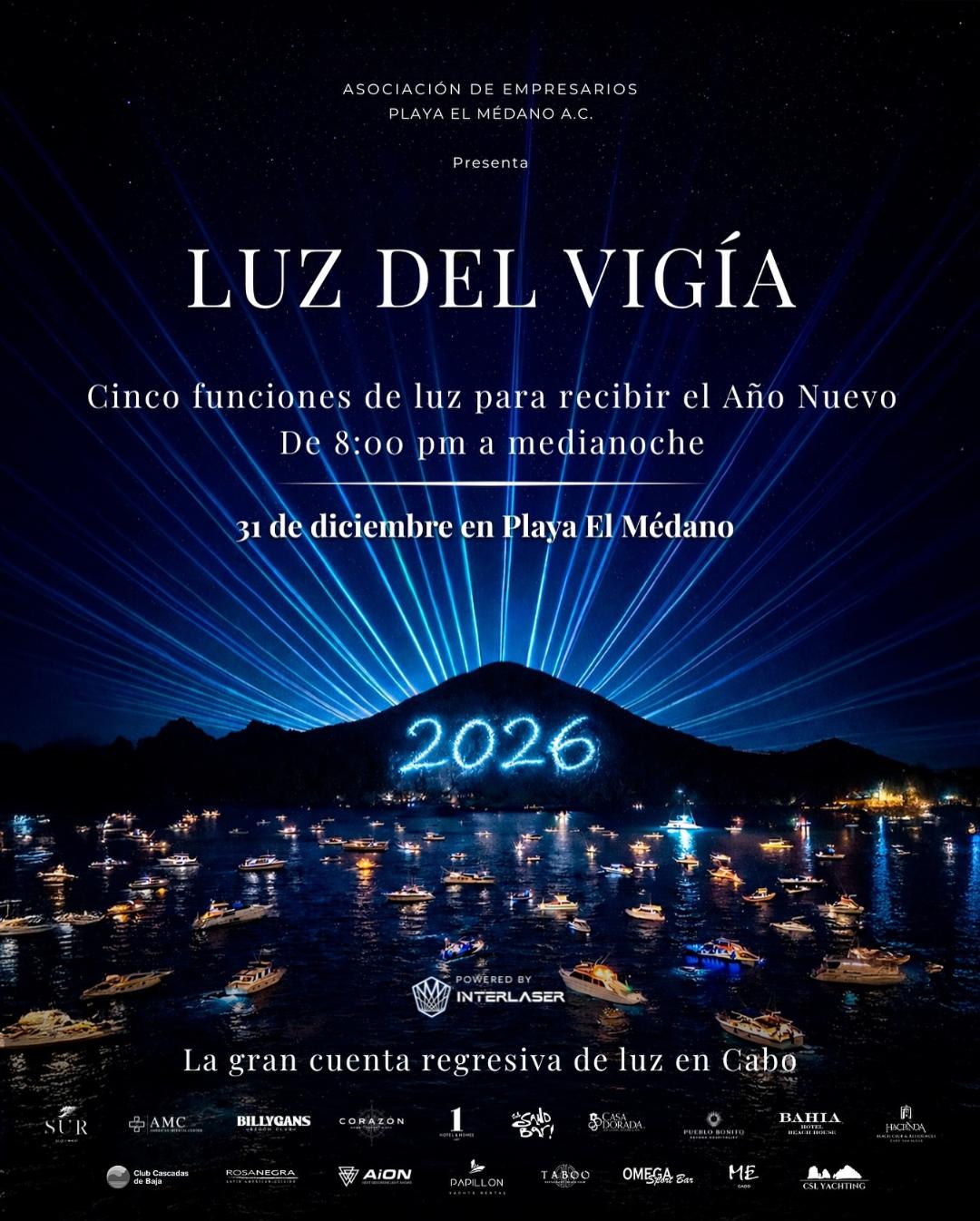 Los Cabos, Baja California Sur.– El XV Ayuntamiento de Los Cabos, a través de la Dirección Municipal de Turismo, invita a residentes y visitantes a celebrar la llegada del Año Nuevo con “Luz del Vigía”, un espectáculo visual innovador y sostenible que iluminará la bahía de Cabo San Lucas la noche del 31 de diciembre, en Playa El Médano. Desde el Gobierno Municipal, que preside el alcalde Christian Agúndez, se refrenda el compromiso de impulsar eventos que fortalezcan la imagen del destino, promuevan la convivencia y ofrezcan experiencias, invitando a la ciudadanía a vivir un Año Nuevo responsable, seguro y memorable en Los Cabos.