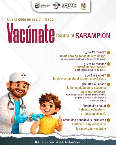 El jueves 19 de febrero de 09:00 a 13:00 horas, se instalará un puesto de vacunación al interior del Palacio Municipal en San José del Cabo, donde se aplicarán dosis contra sarampión, tétano, influenza y hepatitis B, como parte de esta estrategia interinstitucional entre los tres órdenes de gobierno.