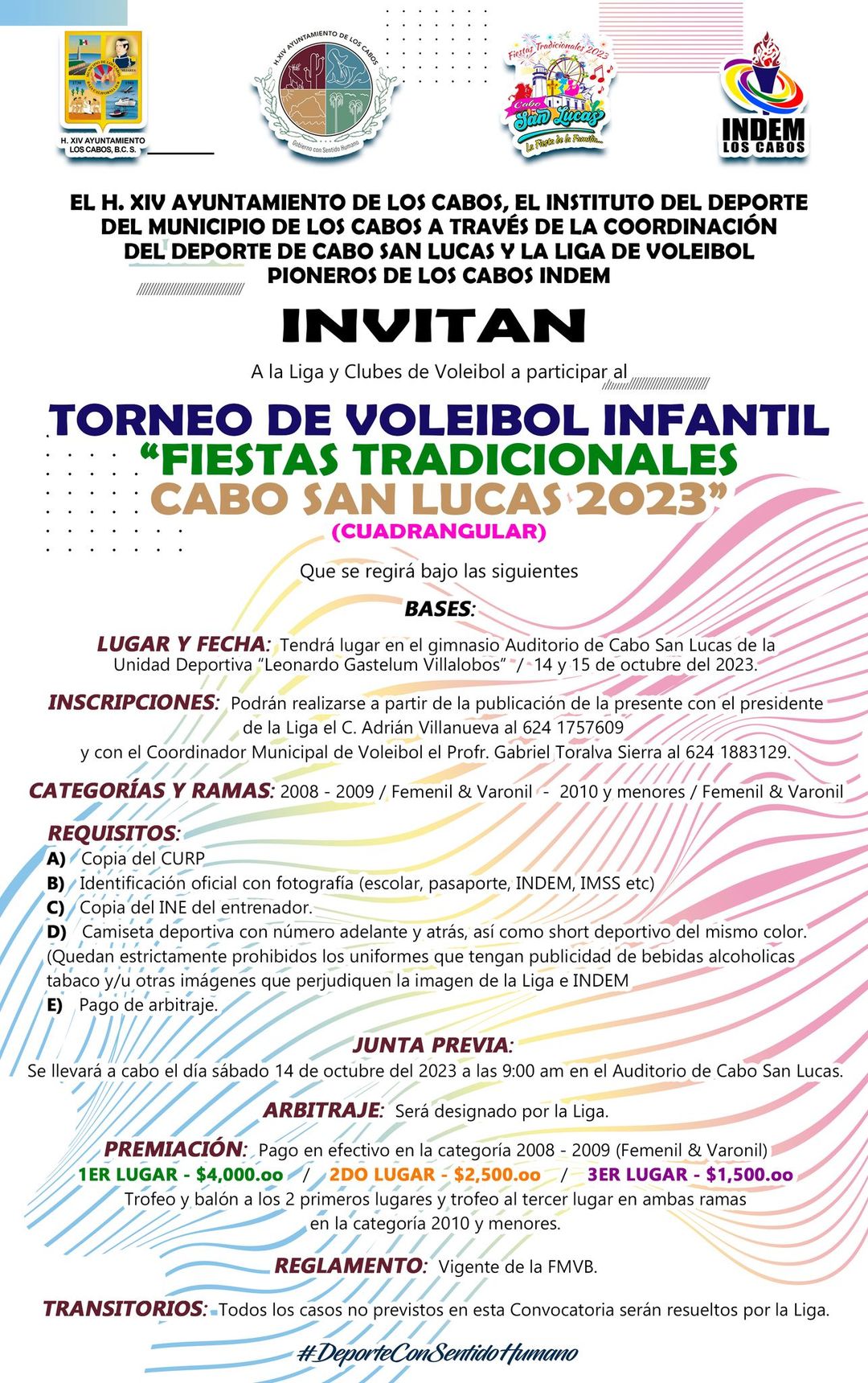 Los Cabos, B.C.S, 11 octubre 2023.- Promoviendo el deporte y la salud en niñas y niños, el XIV Ayuntamiento de Los Cabos que preside Oscar Leggs Castro, a través del Instituto del Deporte del Municipio de Los Cabos (INDEM) encabezado por Ricardo Manríquez Castillo, realizará este 14 y 15 de octubre un torneo de voleibol infantil, en el marco de las Fiestas Tradicionales Cabo San Lucas 2023.