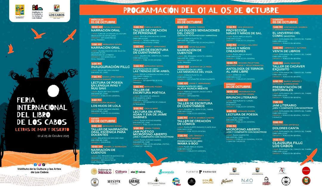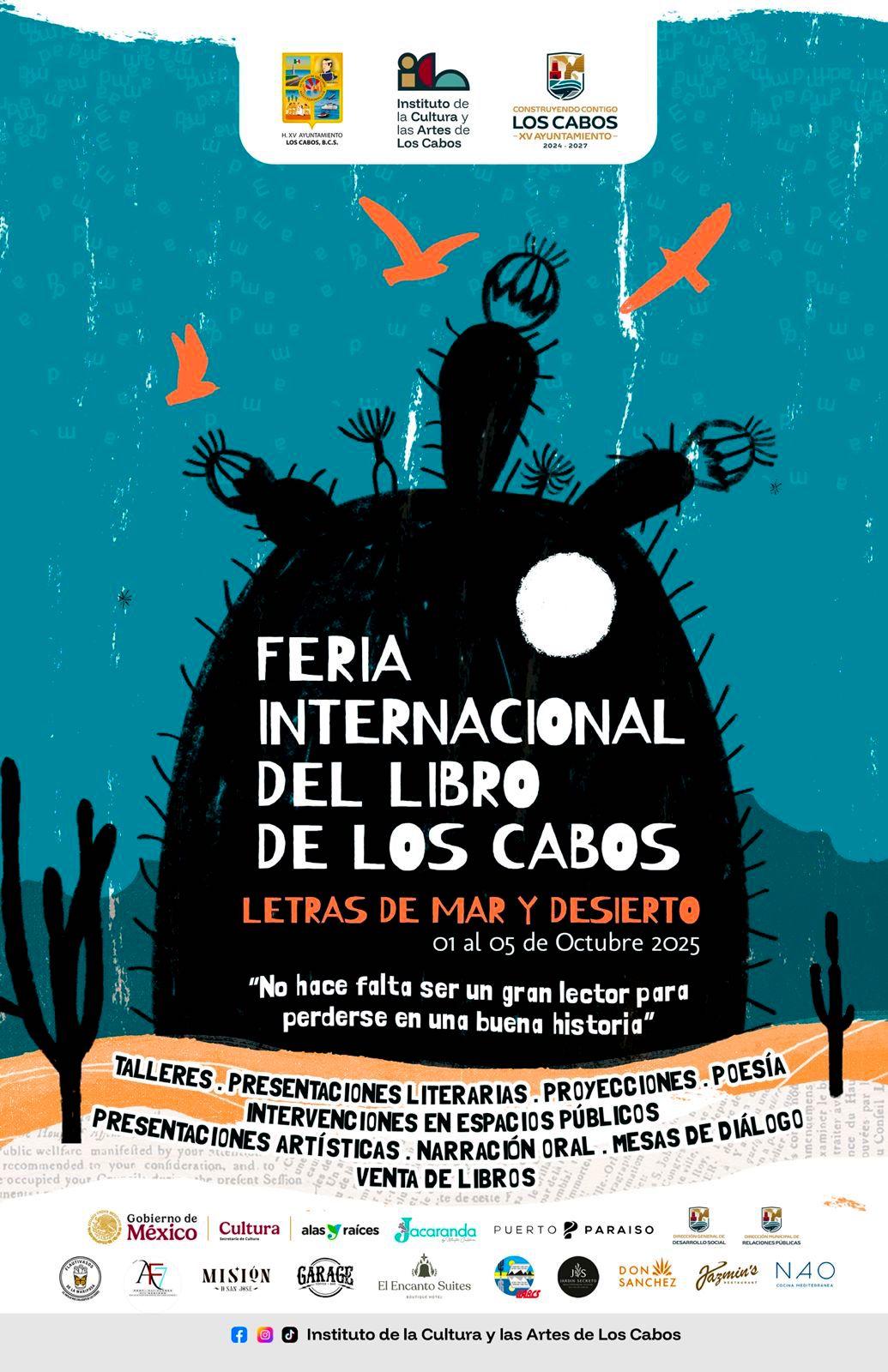 Los Cabos, Baja California Sur.- Con el lema «Letras de Mar y Desierto», se realizará del 01 al 05 de octubre en distintas locaciones del municipio de Los Cabos, la Feria Internacional del Libro de Los Cabos 2025 (FILLC); un evento, organizado por el Instituto de la Cultura y las Artes (ICA) del XV Ayuntamiento de Los Cabos, que busca fomentar la lectura y consolidar a Los Cabos como un espacio donde convergen las letras y las artes.