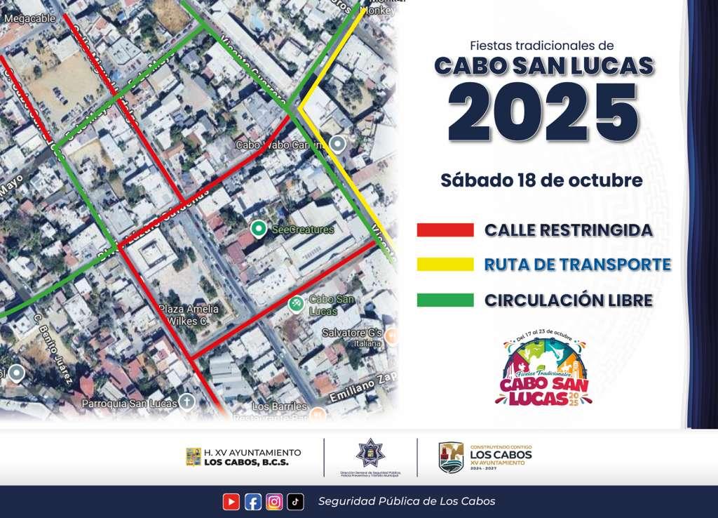 Los Cabos, Baja California Sur.– Con el objetivo de mantener el orden y la seguridad vial durante las Fiestas Tradicionales Cabo San Lucas 2025, la Dirección de Tránsito Municipal, a cargo del suboficial José David Pérez Torres, implementará un operativo especial de movilidad del 17 al 22 de octubre.