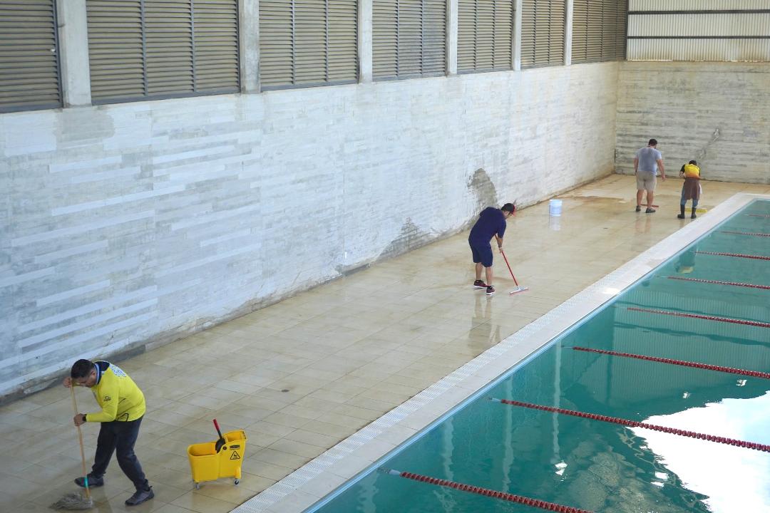 Los Cabos, Baja California Sur.- El director general del Instituto del Deporte del Municipio de Los Cabos (INDEM), Elton Emmanuel Olachea Arce, acompañado por el subdirector del Deporte Patrick Rivera López y el coordinador de Cabo San Lucas David Rodríguez, llevó a cabo una intensa jornada de limpieza y rehabilitación en la Alberca Olímpica que se localiza en el centro deportivo Don Koll, al ser uno de los espacios que resultó con grandes afectaciones tras el paso del huracán Lorena.