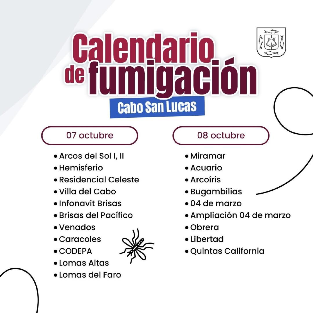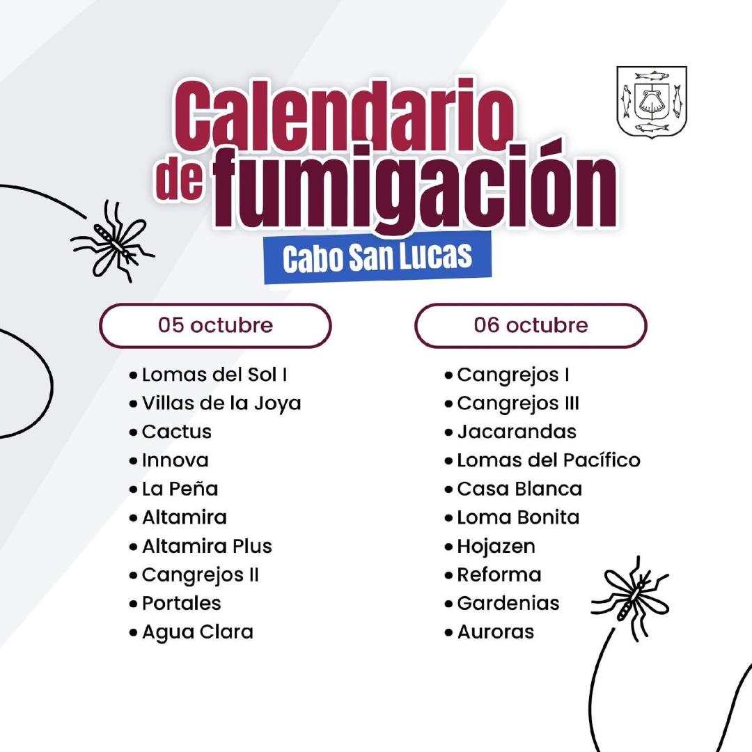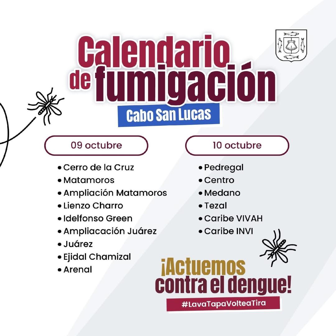 Los Cabos, Baja California Sur.– El XV Ayuntamiento de Los Cabos, que preside Christian Agúndez Gómez, en coordinación con la Secretaría de Salud del Gobierno de Baja California Sur, informa que del 03 al 10 de octubre se desarrollará la segunda etapa de las jornadas de fumigación contra el mosquito transmisor del dengue en Cabo San Lucas. El viernes 03 de octubre será en las colonias El Progreso, Tierra y Libertad, Mesa Colorada I y Lomas del Sol III.