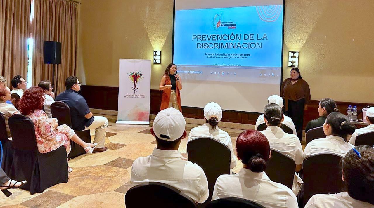 Los Cabos, Baja California Sur.- A través del Instituto de las Mujeres del Municipio de Los Cabos (IMMLC), en colaboración con la Coordinación Municipal de Derechos Humanos, se impartió la capacitación «Distintivo de Igualdad Sustantiva», dirigido al personal del hotel Pueblo Bonito, actividad que se centró en el eje 6 del distintivo, relativo a la Prevención de la Discriminación.