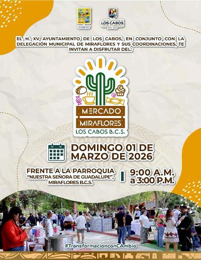Los Cabos, Baja California Sur.– Con el objetivo de promover el talento local, fomentar el consumo responsable y fortalecer la economía comunitaria en las zonas rurales del municipio, el XV Ayuntamiento de Los Cabos invita a las familias cabeñas y visitantes para asistir al tradicional “Mercado Miraflores”, un espacio destinado al sano esparcimiento y al apoyo directo a productores y emprendedores de la región.