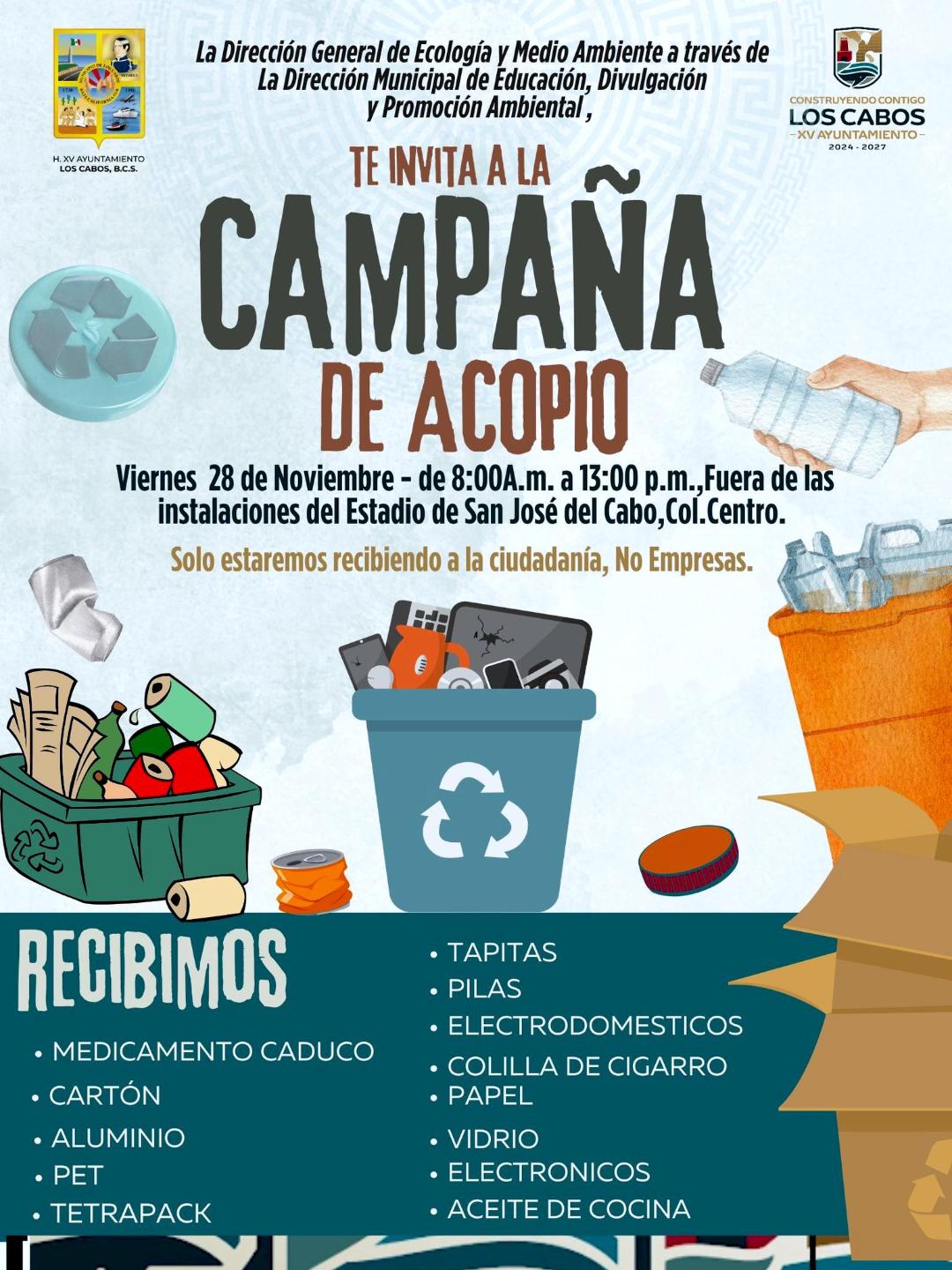 Los Cabos, Baja California Sur.– El XV Ayuntamiento de Los Cabos, a través de la Dirección General de Ecología y Medio Ambiente y la Dirección Municipal de Educación, Divulgación y Promoción Ambiental, convoca a la ciudadanía a sumarse a la Campaña de Acopio de Residuos Reciclables, iniciativa orientada a fortalecer la sostenibilidad y fomentar prácticas responsables en el manejo de residuos.