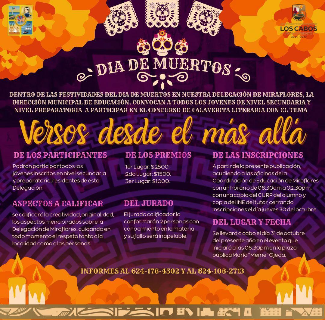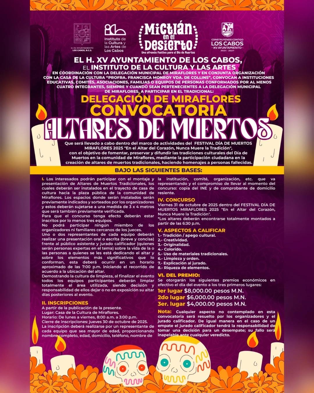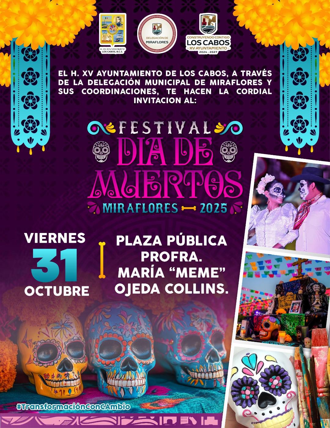 Los Cabos, Baja California Sur.– El XV Ayuntamiento de Los Cabos, a través de la Delegación Municipal de Miraflores y sus distintas coordinaciones, invita a la ciudadanía a participar en el Festival Día de Muertos Miraflores 2025, que se llevará a cabo este viernes 31 de octubre en la plaza pública Profesora María “Meme” Ojeda Collins, bajo el lema “En el altar del corazón, nunca muere la tradición”.