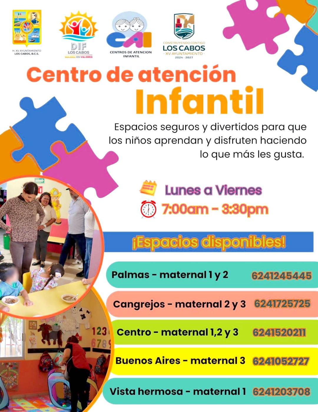 El sistema cuenta con disponibilidad en distintos centros del municipio. En San José del Cabo, se brinda atención en la colonia Centro (624 152 0211), Buenos Aires (624 105 2727) y Vista Hermosa (624 120 3708); mientras que en Cabo San Lucas se ubican los centros en Palmas (624 124 5445) y Cangrejos (624 172 5725), con niveles de maternal 1, 2 y 3.