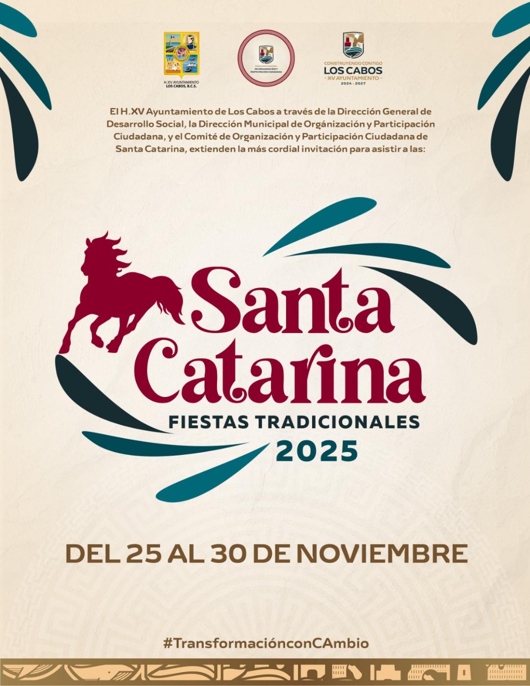 Los Cabos, Baja California Sur.– El XV Ayuntamiento de Los Cabos, a través de la Dirección General de Desarrollo Social, a través de la Dirección Municipal de Organización y Participación Ciudadana, invita a la comunidad a participar en las Fiestas Tradicionales de Santa Catarina 2025, que se realizarán del 25 al 30 de noviembre, con un programa que integra actividades religiosas, deportivas, culturales y artísticas para fortalecer la convivencia y preservar las tradiciones de esta localidad.