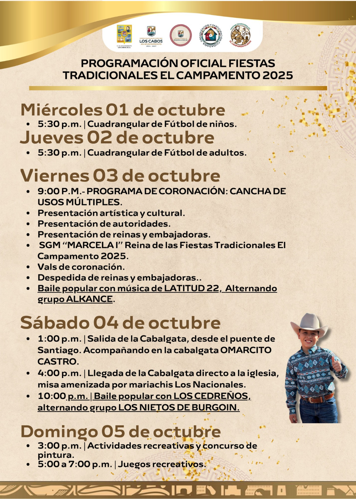 Los Cabos, Baja California Sur.- Con el propósito de fortalecer la identidad cultural, promover la convivencia familiar y preservar las costumbres de la comunidad, este miércoles 1 de octubre dieron inicio las Fiestas Tradicionales El Campamento 2025, mismas se celebran del 1 al 5 de octubre en la delegación de Santiago.