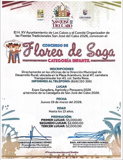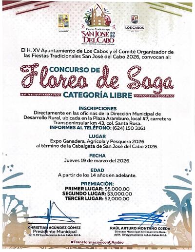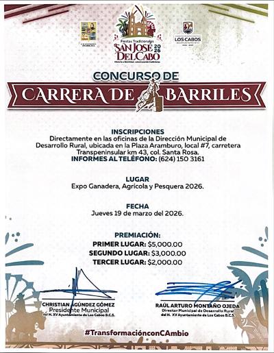 La jornada iniciará al término de la tradicional Cabalgata de San José del Cabo 2026 y contempla los concursos de Floreo de Soga en categorías Infantil y Libre, así como la Carrera de Barriles. Además, uno de los eventos principales será el Concurso de Caballos Bailadores en categoría Libre, programado a partir de las 16:00 horas en el recinto de la Expo Ganadera.