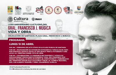 Los Cabos, Baja California Sur.– El XV Ayuntamiento de Los Cabos, a través del Instituto de la Cultura y las Artes (ICA), en coordinación con el Gobierno de Baja California Sur, el Instituto Sudcaliforniano de Cultura, el Archivo Histórico “Pablo L. Martínez”, la Dirección General de Desarrollo Social y la Delegación de Santiago, convocan a la ciudadanía a participar en la conmemoración del LXXII Aniversario Luctuoso del Gral. Francisco J. Múgica.