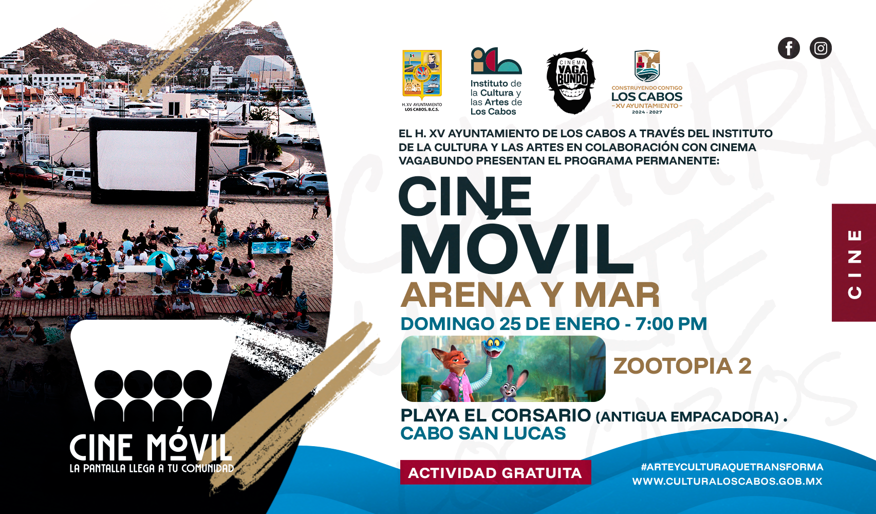 Los Cabos, Baja California Sur.– El XV Ayuntamiento de Los Cabos, a través del Instituto de la Cultura y las Artes (ICA), y en colaboración con Cinema Vagabundo, invita a la ciudadanía a disfrutar de una función especial de cine al aire libre en playa El Corsario, en Cabo San Lucas.