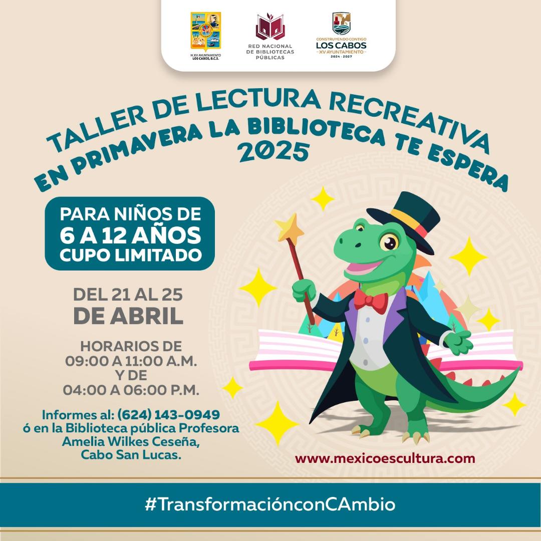 Los Cabos, Baja California Sur.- Con el fin de fomentar la convivencia a través del aprendizaje y la diversión, del lunes 21 al viernes 26 de abril se realizarán los talleres recreativos del programa “En Primavera la Biblioteca te Espera 2025”, promovidos por el XV Ayuntamiento de Los Cabos, a través de la biblioteca pública “Amelia Wilkes Ceseña” en Cabo San Lucas.