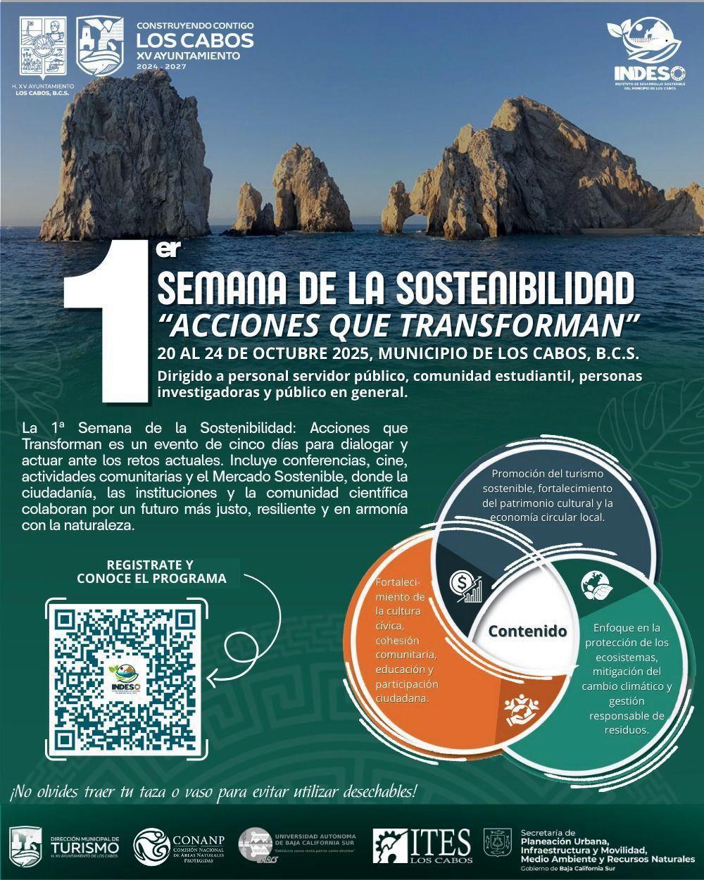 Los Cabos, Baja California Sur.- Con el compromiso de fortalecer la cultura cívica, la cohesión comunitaria y la participación ciudadana, el XV Ayuntamiento de Los Cabos, a través del Instituto de Desarrollo Sostenible (INDESO), invita a la ciudadanía a participar en la primera “Semana de la Sostenibilidad: Acciones que Transforman”, un espacio de encuentro, diálogo y acción frente a los retos ambientales y sociales que marcan la actualidad.