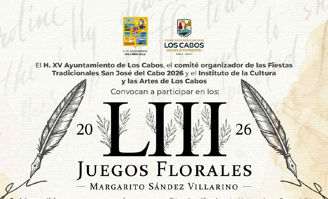 Los Cabos, Baja California Sur.– El XV Ayuntamiento de Los Cabos, a través del Comité Organizador de las Fiestas Tradicionales San José del Cabo 2026 y el Instituto de la Cultura y las Artes (ICA), convoca a participar en el Concurso de Poemarios de los LIII Juegos Florales “Margarito Sández Villarino”, certamen literario dirigido a personas mayores de edad, sudcalifornianas y/o con residencia comprobable mínima de tres años en el estado de Baja California Sur.