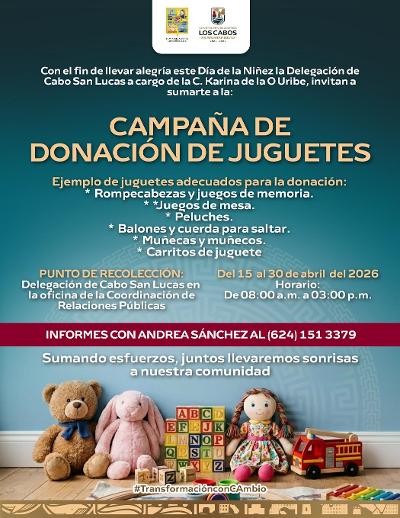 Los Cabos, Baja California Sur.– El XV Ayuntamiento de Los Cabos, a través de la Delegación de Cabo San Lucas y en coordinación con el área de Relaciones Públicas, invita a la ciudadanía a participar en la Campaña de Donación de Juguetes en el marco de la celebración del Día de la Niñez.