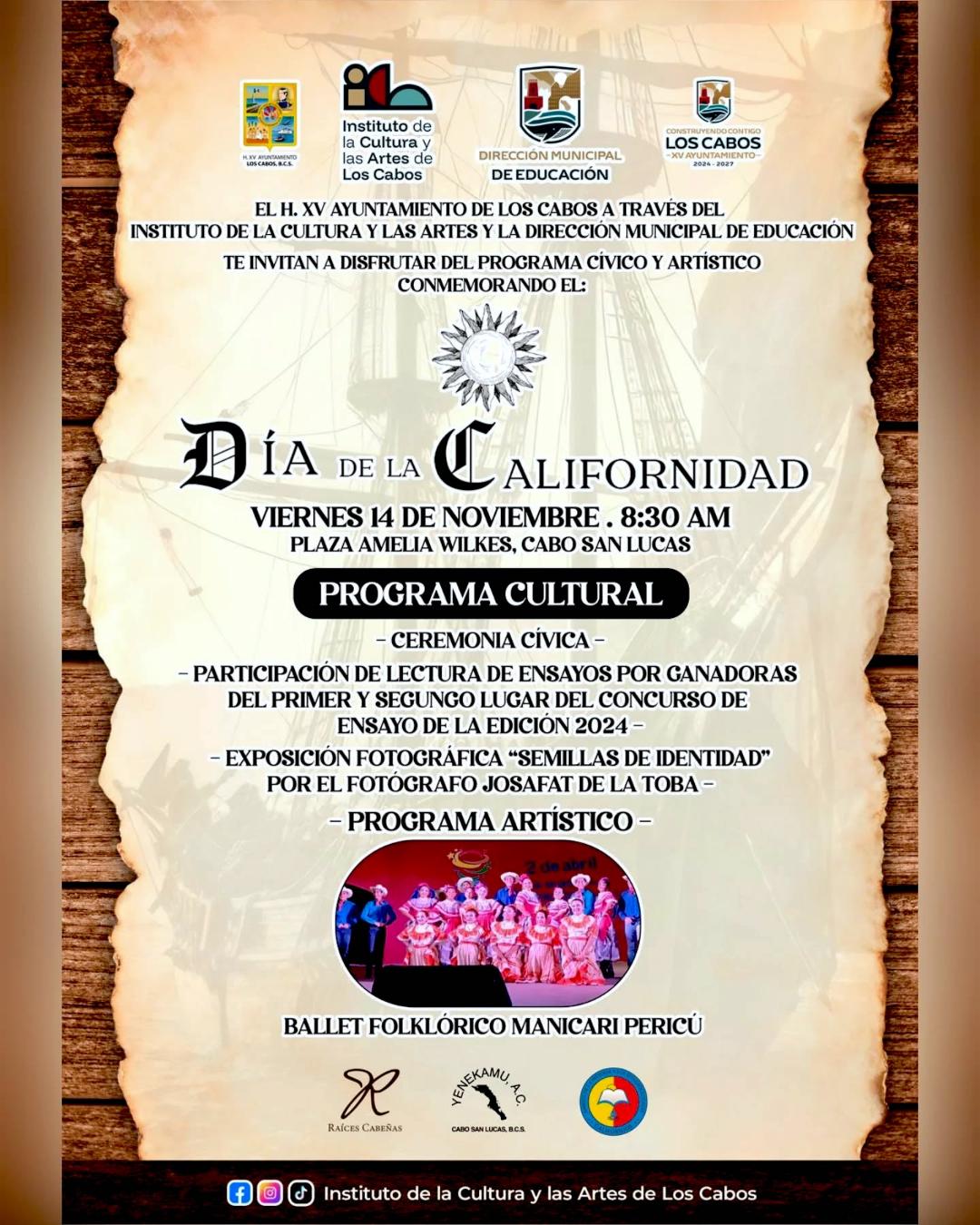 Los Cabos, Baja California Sur.– El XV Ayuntamiento de Los Cabos, a través del Instituto de la Cultura y las Artes (ICA) y la Dirección Municipal de Educación, invita a la ciudadanía a participar en el programa cívico y cultural conmemorativo por el Día de la Californidad, que se llevará a cabo el viernes 14 de noviembre a las 08:30 horas en la plaza pública Amelia Wilkes Ceseña, en Cabo San Lucas.