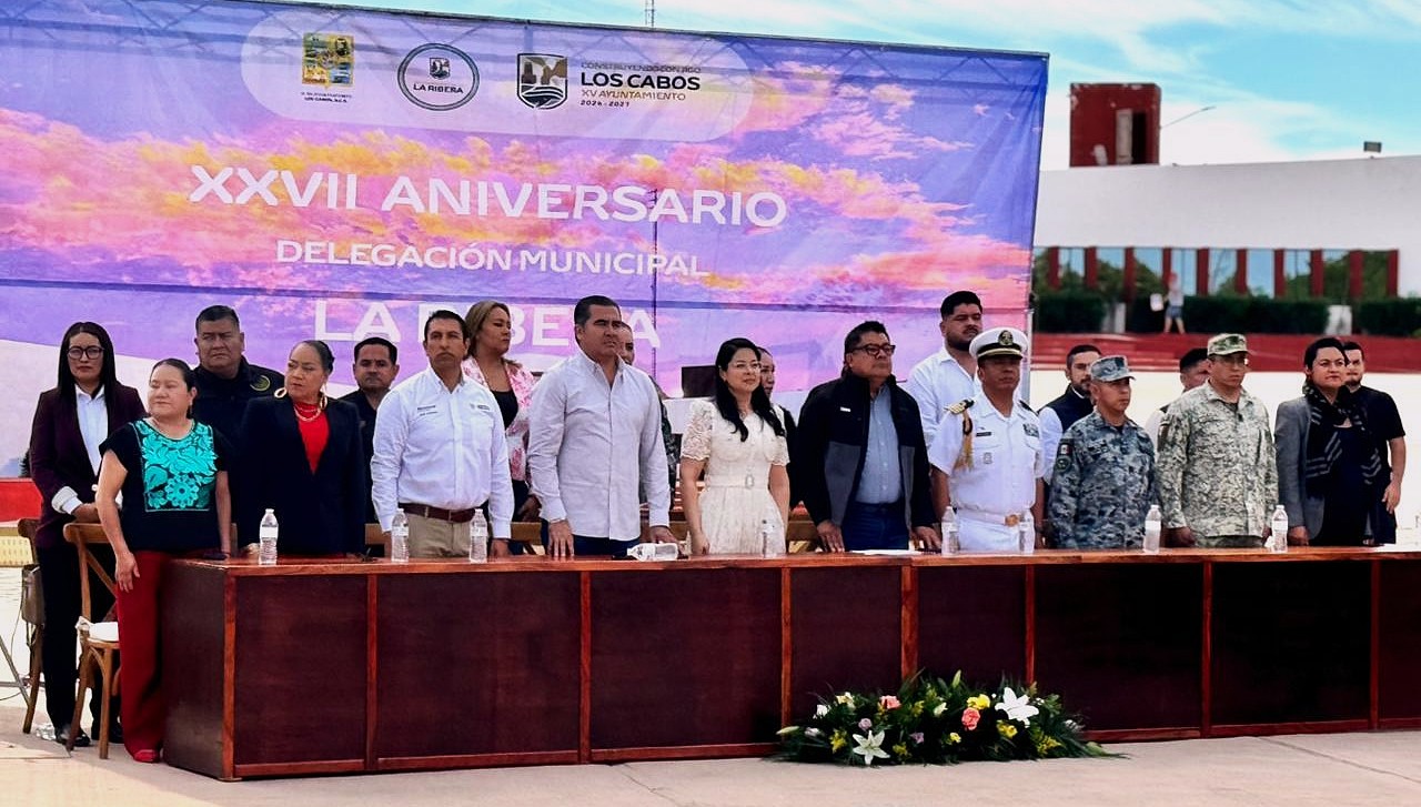 Los Cabos, Baja California Sur.– En el marco del XXVII aniversario de la conversión a Delegación Municipal de La Ribera, autoridades de los tres órdenes de gobierno y ciudadanía en general participaron en un acto cívico solemne que permitió reconocer la relevancia histórica de esta comunidad, así como la identidad, el arraigo y el esfuerzo de las generaciones que han contribuido a su desarrollo.