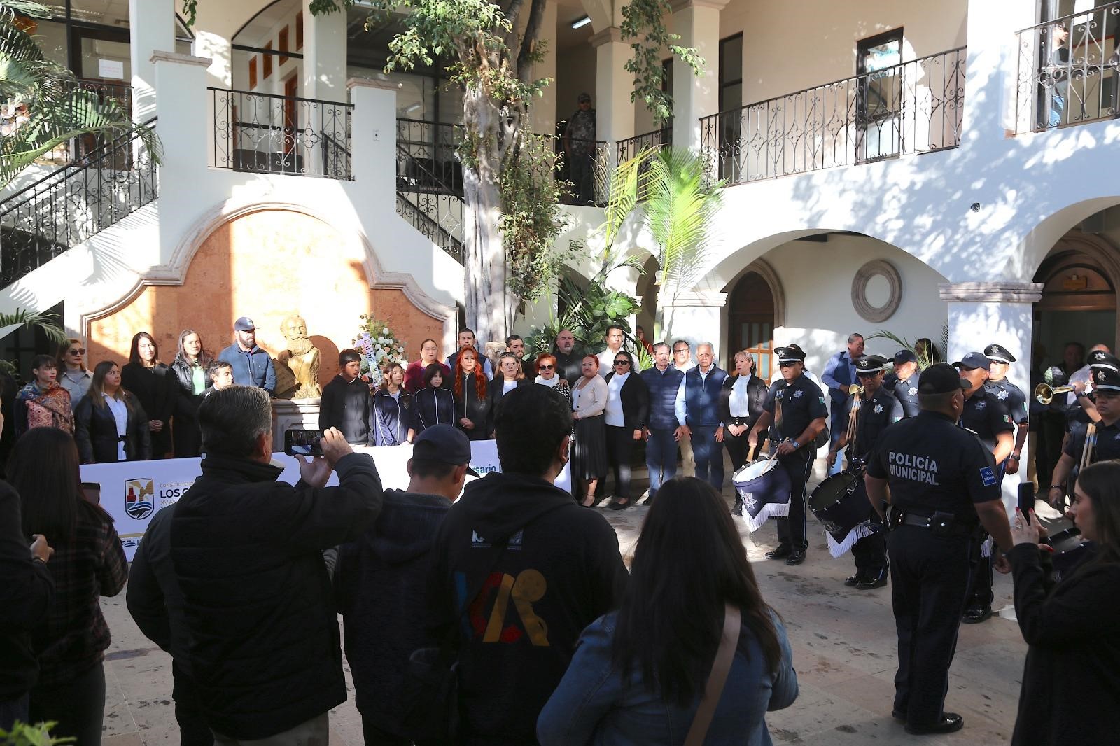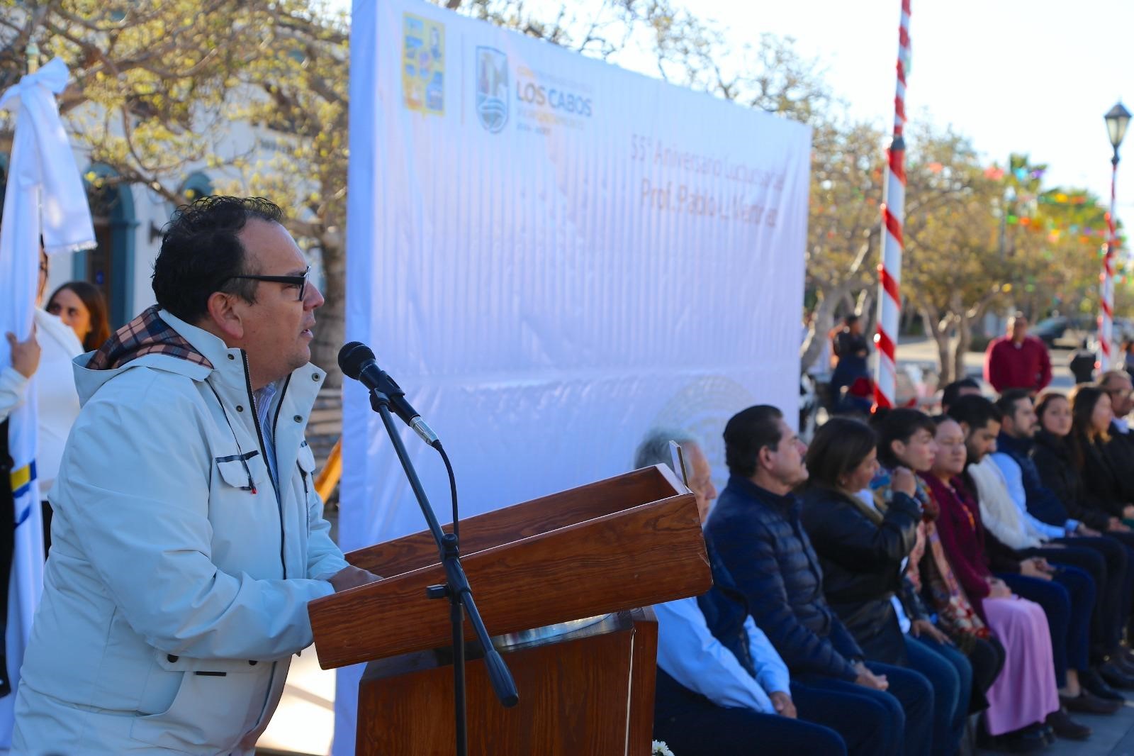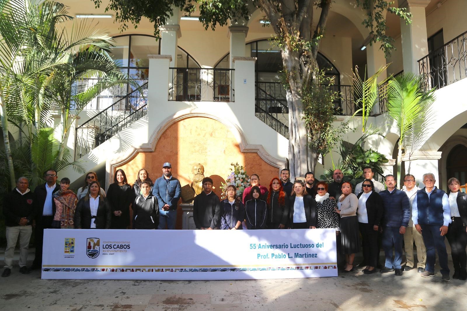 Los Cabos, Baja California Sur.- Este lunes 13 de enero, autoridades del XV Ayuntamiento de Los Cabos, encabezadas el Quinto Regidor, realizaron una ceremonia cívica por el LV (Quincuagésimo Quinto Aniversario) Aniversario Luctuoso del profesor Pablo L. Martínez, acto que se desarrolló en el marco de los honores a los Lábaros Patrios efectuados en la explanada frente a Palacio Municipal en San José del Cabo.