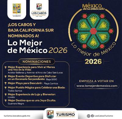 Los Cabos, Baja California Sur.– El XV Ayuntamiento de Los Cabos, a través de la Dirección Municipal de Turismo invita a la ciudadanía y visitantes a participar en la votación de la octava edición de “Lo Mejor de México 2026”, organizada por la revista México Desconocido, donde el destino cuenta con nominaciones que reconocen su atractivo a nivel nacional.